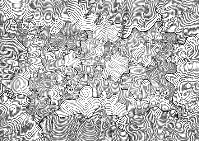 Pattern is a mesmerizing black fineliner drawing that invites the viewer into a trancelike state of awareness. See description below.