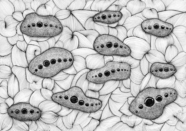 Stones on Wool is a whimsical black fineliner artwork that playfully explores the contrast of opposites. See description below.